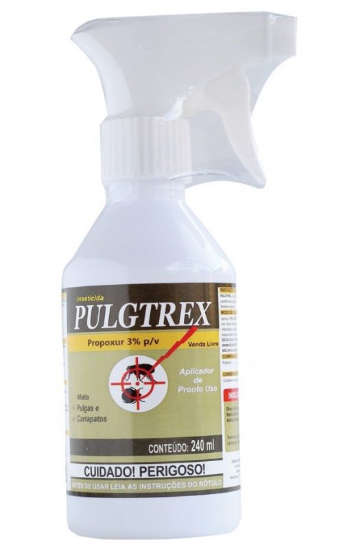 PULGTREX MATA PULGAS é um eficiente inseticida de pronto uso formulado com o principio ativo PROPOXUR, eficaz no controle das pulgas (Ctenocephalides Félis) e Carrapatos (Rhipicephalus Sanguineus), proveniente do homeme do animal..